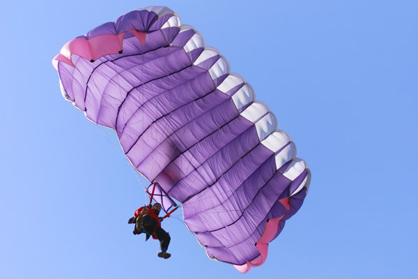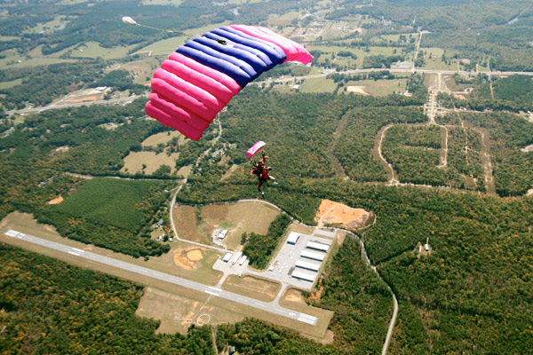 The first time jumper exits the aircraft from an altitude of 10,000 to 14,000 feet and experiences 30 to 60 seconds of free fall. At 5,000 feet, the instructor deploys a huge ram-air parachute designed for two. The student can have their choice of a gentle or thrilling parachute ride to the ground, where they should experience a soft landing back on Alabama soil. Tandem parachuting allows many disabled people, subject to a satisfactory risk assessment, to experience the thrill of skydiving. Tandem jumpers who are bitten by the skydiving bug can move on to Accelerated Free Fall for more advanced training.